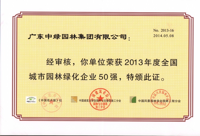 中綠集團同仁憑借多年精心經營,在本屆的2013年度全國城市園林綠化企業50強評選活動中榮獲“全國2013年度城市園林綠化企業50強”的榮譽稱號。