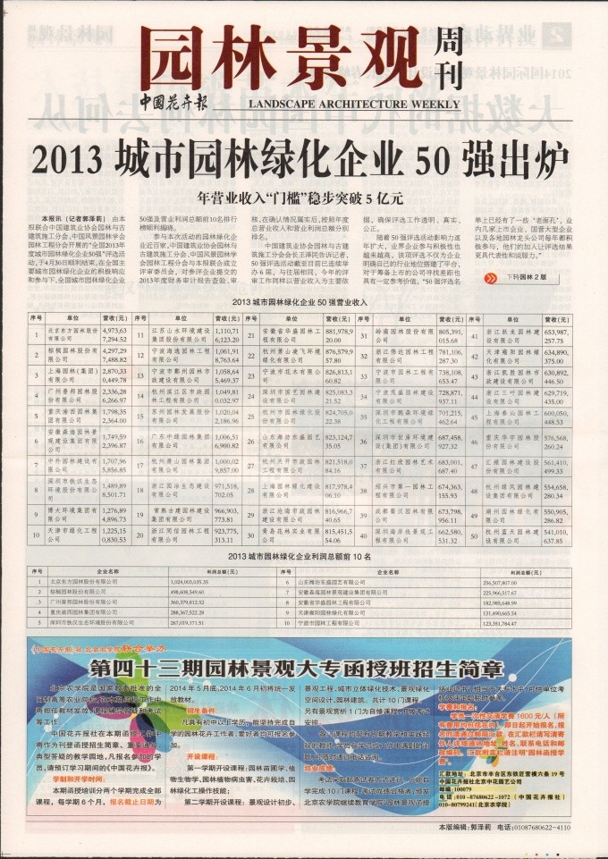近日,由中國花卉報聯合中國建筑業協會園林與古建筑施工分會、中國風景園林學會園林工程分會開展的“全國2013年度城市園林綠化企業50強”評選活動落下帷幕。全國城市園林綠化企業50強、營業利潤總額前10名,以及凈營業利潤率、凈資產利潤率、總資產利潤率前10名排行榜一同揭曉。