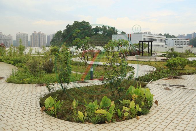 作為深圳市綠色建筑的示范工程,深圳高級技工學(xué)校新校區(qū)的建設(shè)大量應(yīng)用了節(jié)能、節(jié)水、節(jié)材和環(huán)境保護等技術(shù)措施,其中包括屋頂花園的建設(shè)。其厚厚的種植土層可以有效隔絕室外的噪音和振動對教室的影響,同時起到隔熱和過濾收集屋頂雨水的作用。大面積的屋頂花園成為教學(xué)樓和生活區(qū)之間的活動場所,彌補了校園內(nèi)稀缺的平面活動場所。