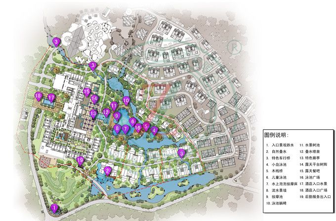利用現有地形、植被、景觀資源,營造別具特色的山地溫泉度假勝地,溪流、現有植物群落、山地巧妙穿插于滌蕩心靈塵世居所之中。盡可能少地破壞現有地勢地貌,依山就勢,理水造型,梳理無序的自然植被體系,利用植物的特性,為環境創造幾近自然的品質空間。